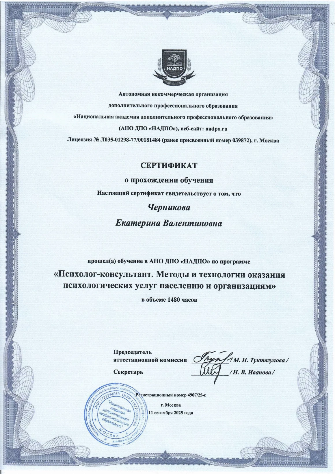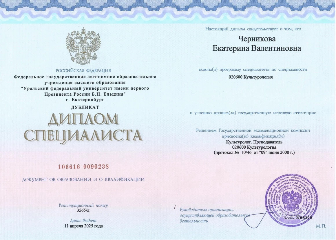 В университете защищала диплом на кафедре философии и истории религии, сейчас учусь в магистратуре по психологии, постоянно повышаю свои знания и навыки, прохожу множество дополнительных курсов.